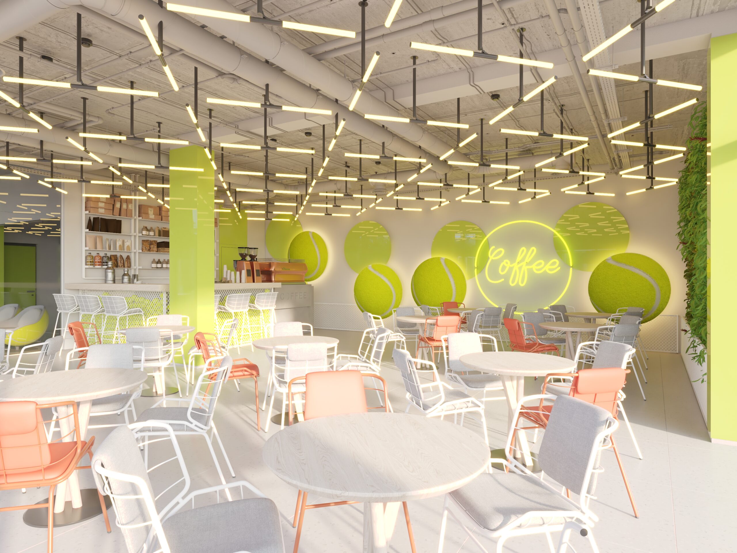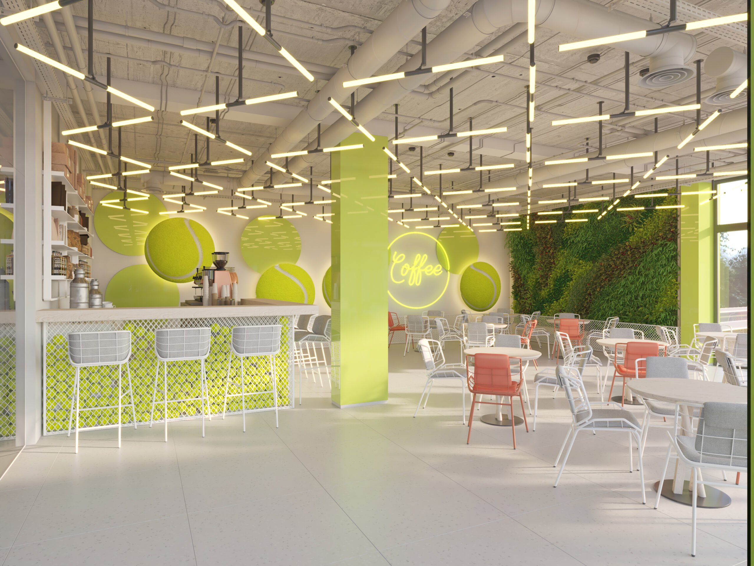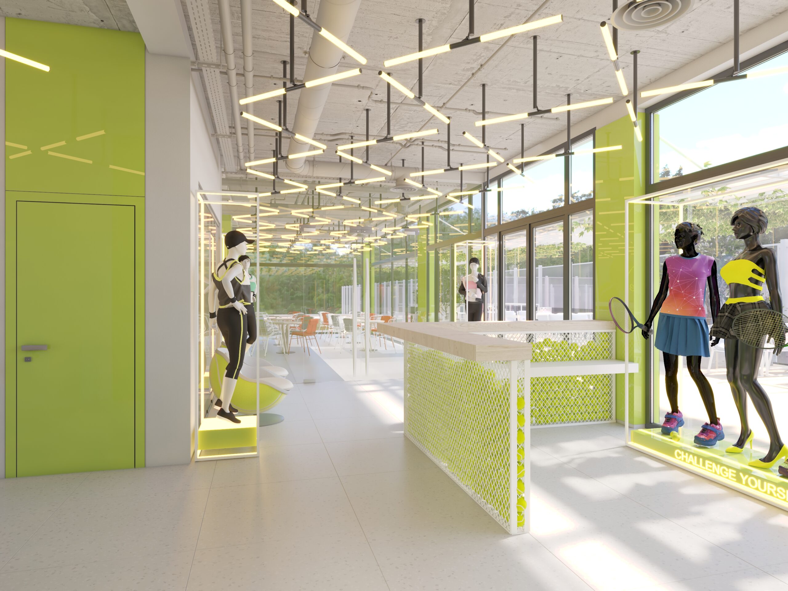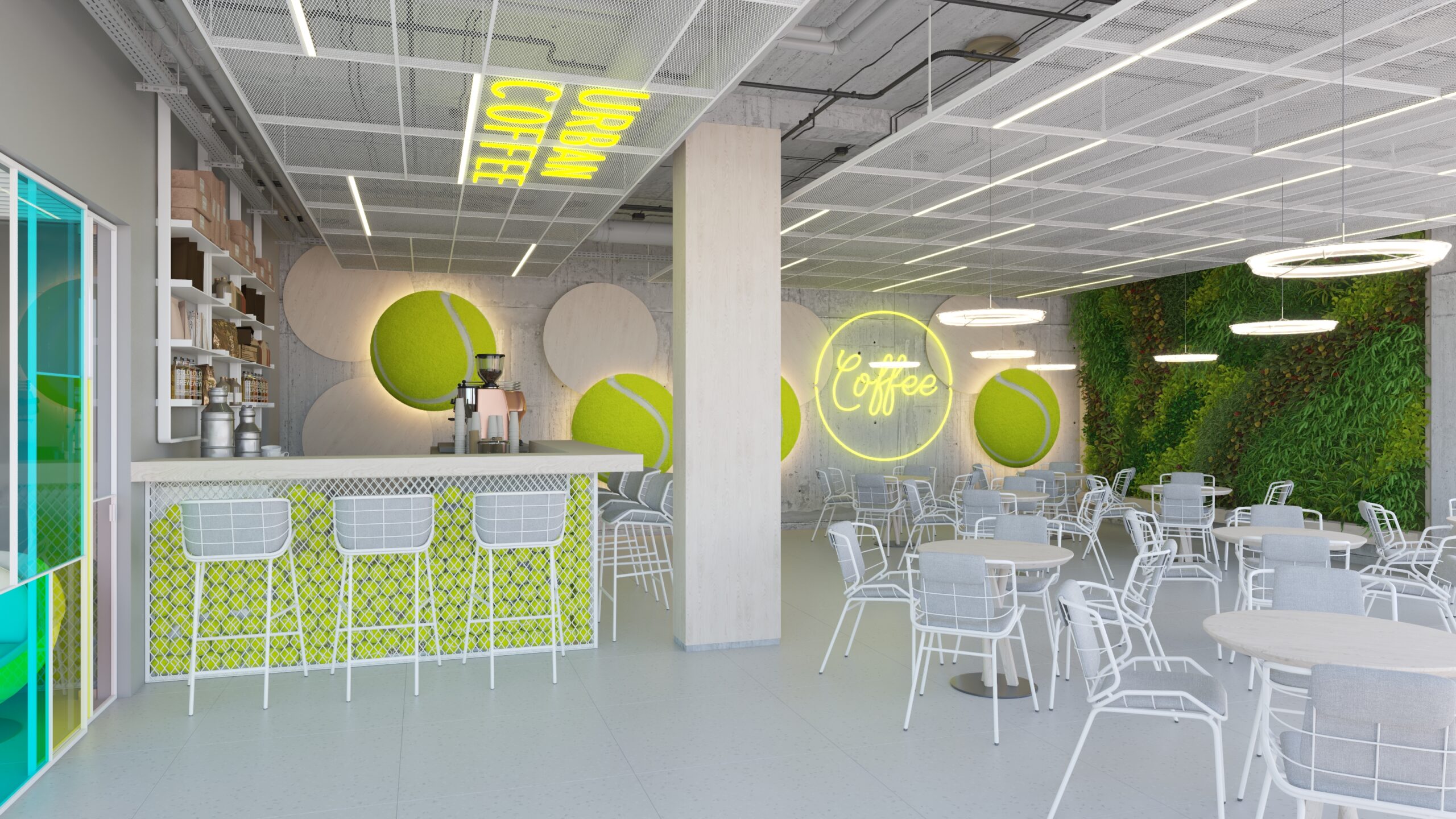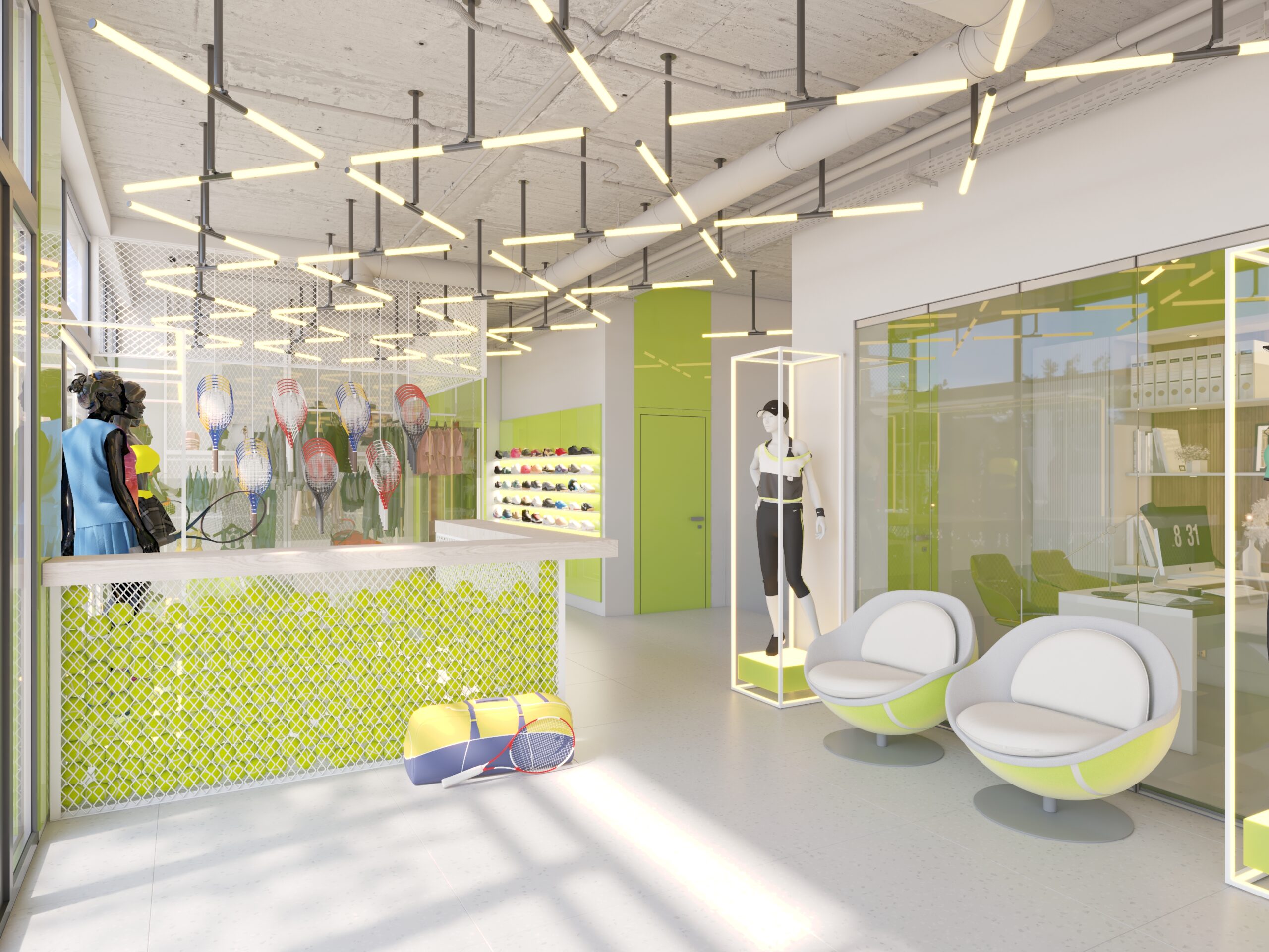 Tennis courts are organized on a field of 8000m2 while the multifunctional building has a construction area of 500m2.
